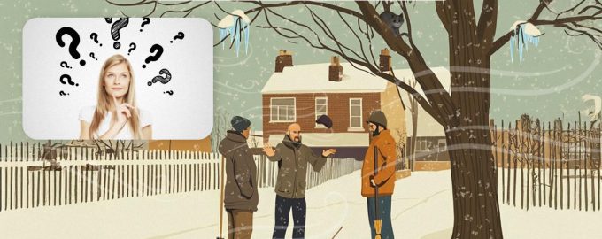 Auf dem Bild sind drei Hausmeister zu sehen, die sich im Winter im Hof unter einem Baum versammelt haben und sich unterhalten. Keiner der Gesprächspartner bemerkte, dass einer von ihnen in ernster Gefahr schwebte.