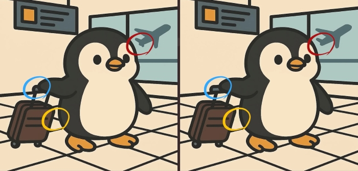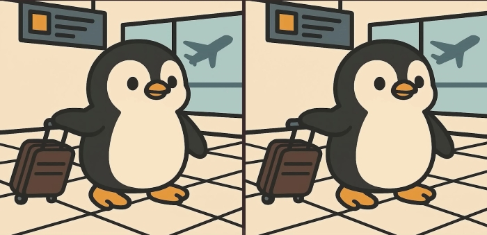 Sind Sie also bereit für die nächste Herausforderung? Schauen Sie sich zwei Bilder von einem niedlichen Pinguin an, der am Flughafen Gepäck trägt. Auf den ersten Blick sehen sie identisch aus, aber es gibt 3 kleine Unterschiede, die sich auf ihnen verstecken. Glaubst du, dass du sie alle in 61 Sekunden finden kannst? Probiere es aus und teste deine Sehschärfe!