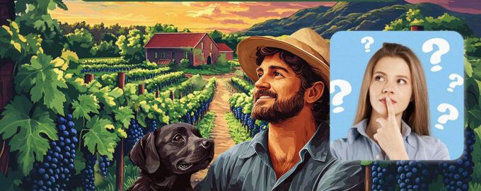 Unten sehen Sie ein Bild eines Weinbergs, in dem ein Mann Trauben pflückt. In der Nähe ist sein treuer Hund, der seinen Besitzer nie allein lässt. Was könnte hier schon ungewöhnlich sein?