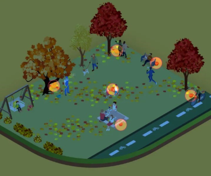 Das Bild zeigt einen herbstlichen Spielplatz, auf dem Menschen und Kinder herumlaufen. Jeder ist mit seinen eigenen Dingen beschäftigt, aber neben einigen von ihnen stehen die Kürbisse, die wir suchen.
